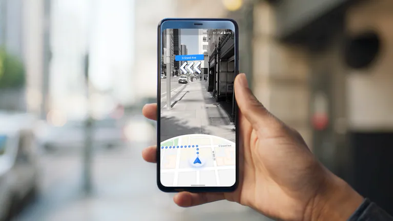 Live View” o “Vista en vivo”, una función que usa realidad aumentada para guiar al usuario con flechas e indicaciones superpuestas sobre la imagen real captada por la cámara del teléfono.